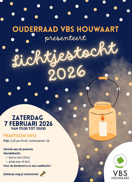 Onze ouderraad organiseert op zaterdag 7 februari een gezellige lichtjestocht. Welkom van 17.30 u. tot 20.30 u. We vertrekken aan de pastorie. Jullie kunnen kiezen tussen een kleine tocht van 2 km en een grote tocht van 4 km. Voor de kinderen is er ook een zoektocht! Vergeet zeker geen zaklamp mee te brengen. We vragen een inkom van €2,5 voor kinderen en €5 voor volwassenen.