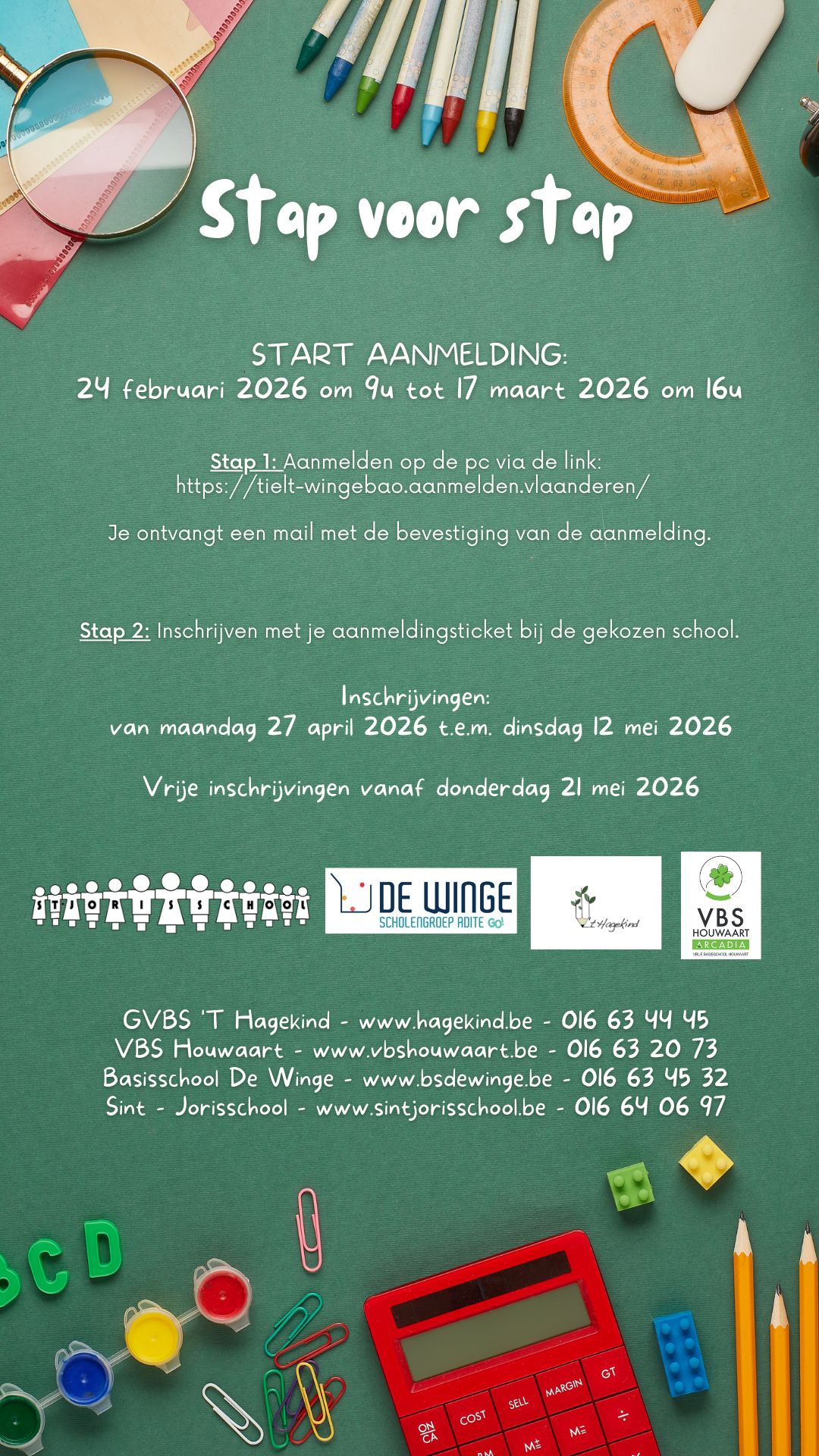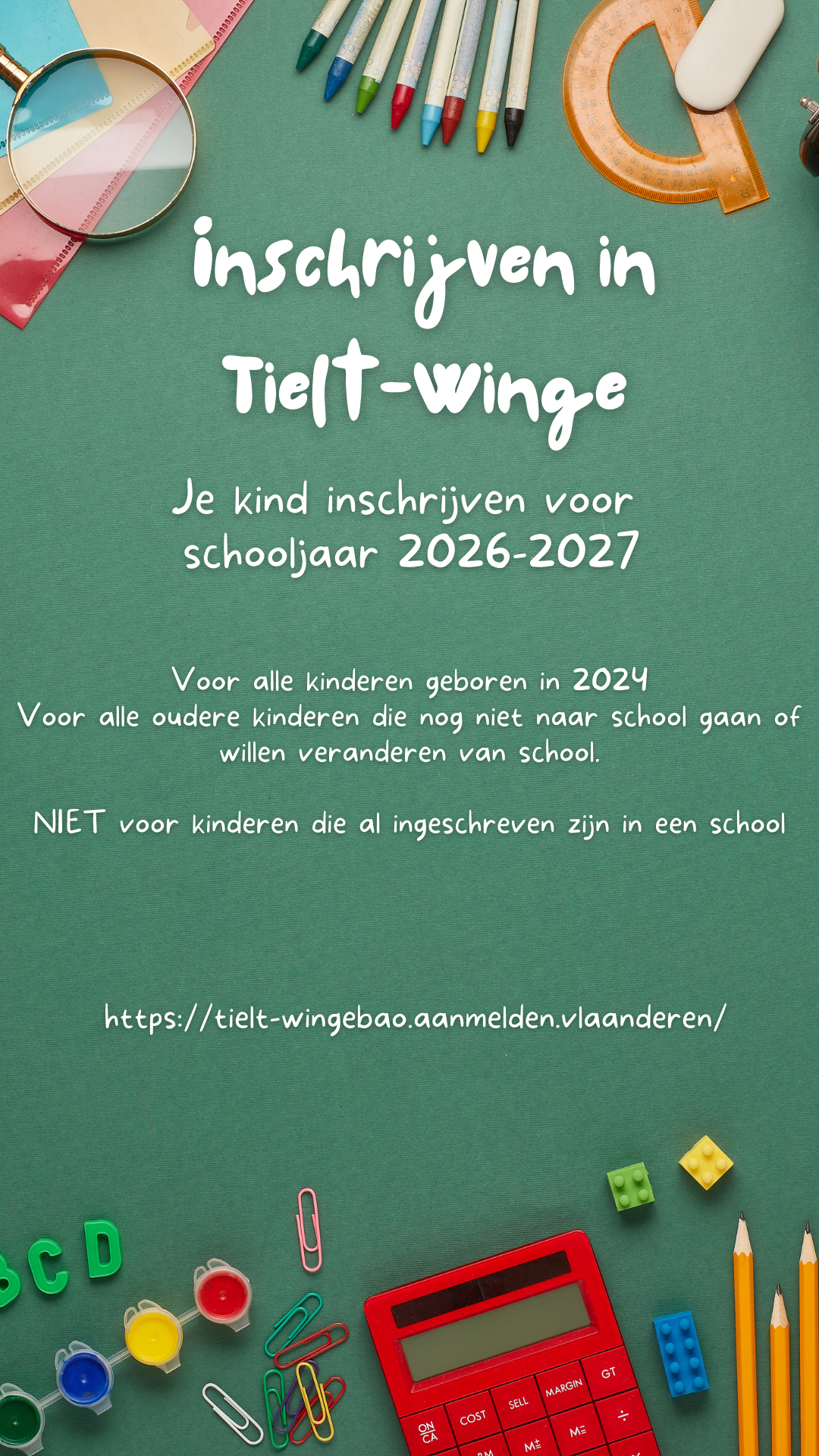 Alle kinderen geboren in 2024 (of vroeger) die nog niet naar school gaan of van school willen veranderen kunnen zich inschrijven in een school. U zal vooraf moeten aanmelden via een digitaal systeem waar u uw school naar keuze uit Tielt-Winge kan opgeven. Dit online aanmelden start op 24 februari2026. Aanmelden kan tot en met 17 maart 2026. Je ontvangt nadien een bevestigingsmail.